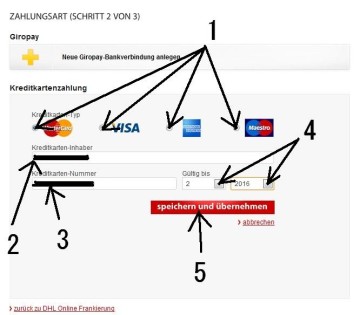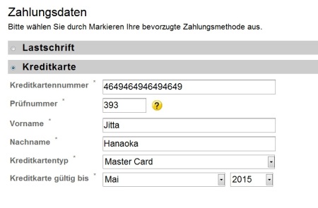Kreditkarte gültig bis クレジットカードの有効期限をそれぞれ記入します。