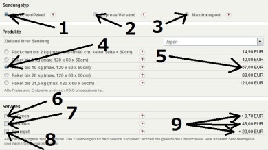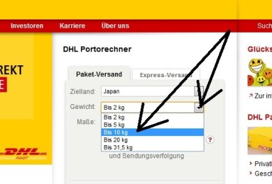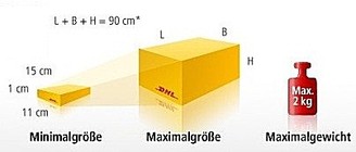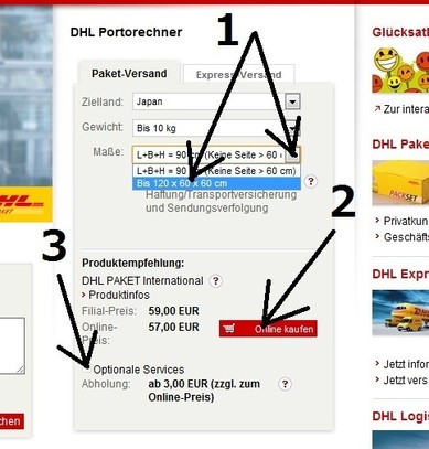 - サイズがオーバーしている場合はここを選びます。最大サイズは下記となります。(※「四角い箱の場合はMax.: 長さ 200 cm, Ø 60 cm, 胴回り (= L + Umfang) = max. 360 cm」「円筒形の場合はMax.: 長さ 200 cm, Gurtmaß (= L + 2xW + 2xH)= max. 360 cm」)