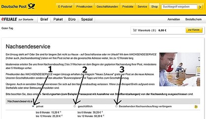 Deutsche Post のウェブサイトのPrivat、Nachsenden(転送サービス)にアクセスして、このページの記入方法を見ながらお申し込みください。