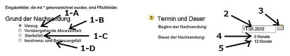 - 一番上のUmzug(引越し)に既に印が付いているのでそのままにします。(1-B = 一時不在、1-C = 死亡、1-D = 個人破産、倒産など))