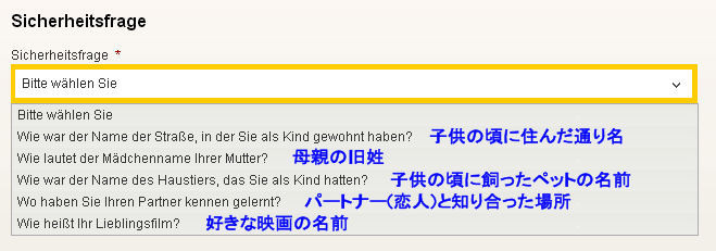 既にパスワードおよびパスワードを忘れた時用のセキュリティークエスチョンとアンサーをご入力済みの場合は、2 のマスの下、Password vergessen? をクリックして質問にお答え下さい。